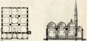 The mosque is a square structure with nine domes, each 13 m in diameter, sitting on four legs and four walls. It falls into the group of multi-domed mosques. The middle row of domes, sorted in threes, is larger than the ones on the other. There is a lighthouse in the middle dome. The main building is made of cut stone and the last congregational place is made of cut stone and brick. There are ornaments in the sequins and walls with baroque features made later. Of the minarets on either side of the mosque, the mosque with the only honor on the left side, and the two honorable ones were later added to the mosque and are separate from the building. There is a fountain on the left side of the entrance to the mosque.