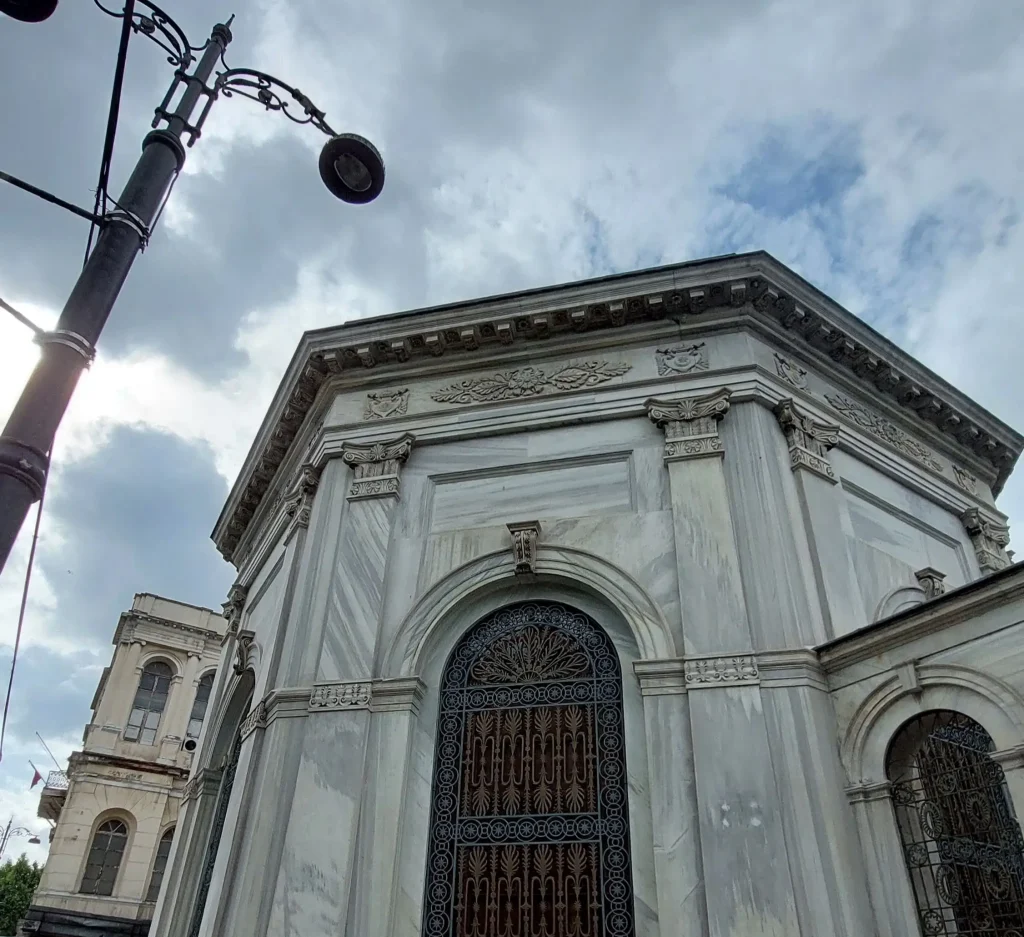 Bir kompleks içerisinde yer alan türbe, Türk ampir üslubunun en önemli örneklerindendir. Türbe sekizgen plank olup kubbe ile örtülüdür. Türbenin üst duvarları ve kubbe alçı kabartma armalarla, çelenklerle ve çiçek sepetleriyle süslüdür. Yapı, sekiz köşesinde yer alan askı kandil ve Birleşik Krallık Kraliçesi 1. Victoria ve eşi Albert’in hediyesi olan avize ile aydınlanmaktadır. Ayrıca türbede Fransız İmparatoru II Napolyon’un hediyesi olan ampir üslupta yaldızlı saatler yer almaktadır.
