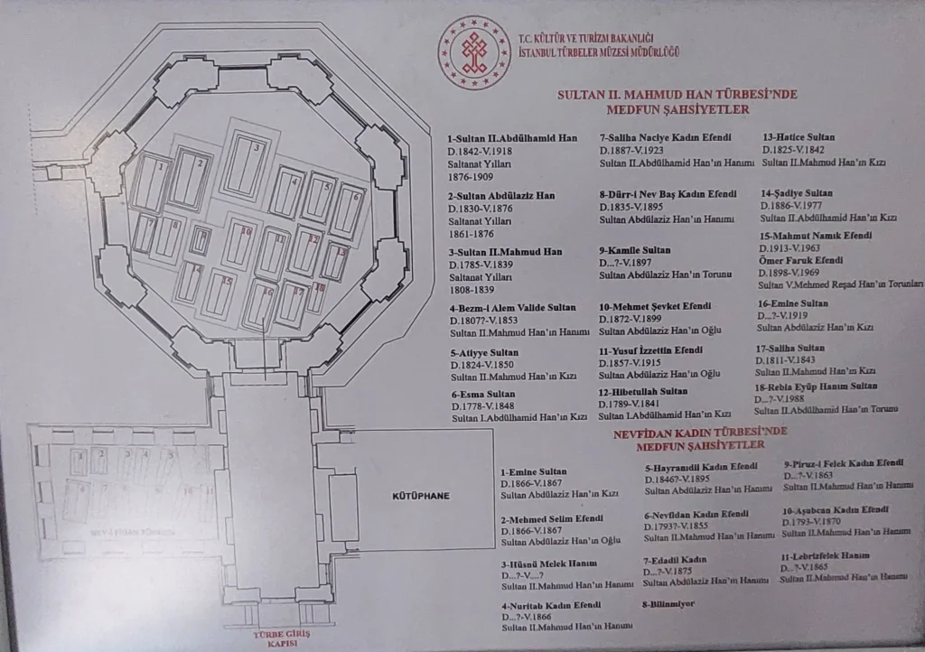 Türbede padişahlarla birlikte Osmanlı hanedan allesine mensup kişiler medfundur. Bu türbenin giriş holünün sol tarafında Istanbul Türbeler Müze Müdürlüğü İhtisas Kütüphanesi, sağ tarafinda ise Sultan I Mahmud Han’in hanimi olan Nevfidan Kadin’in türbesi yer almaktadır.